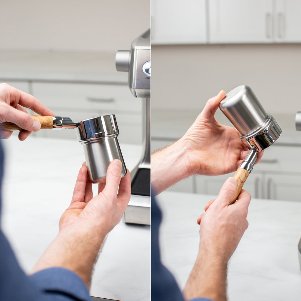 Use the Dosing Cup as a vessel to weigh your beans, dump them into your grinder, and then grind directly into the Cup. Place your portafilter over the top of the Dosing Cup, flip them over, shake to de-clump, and voila!